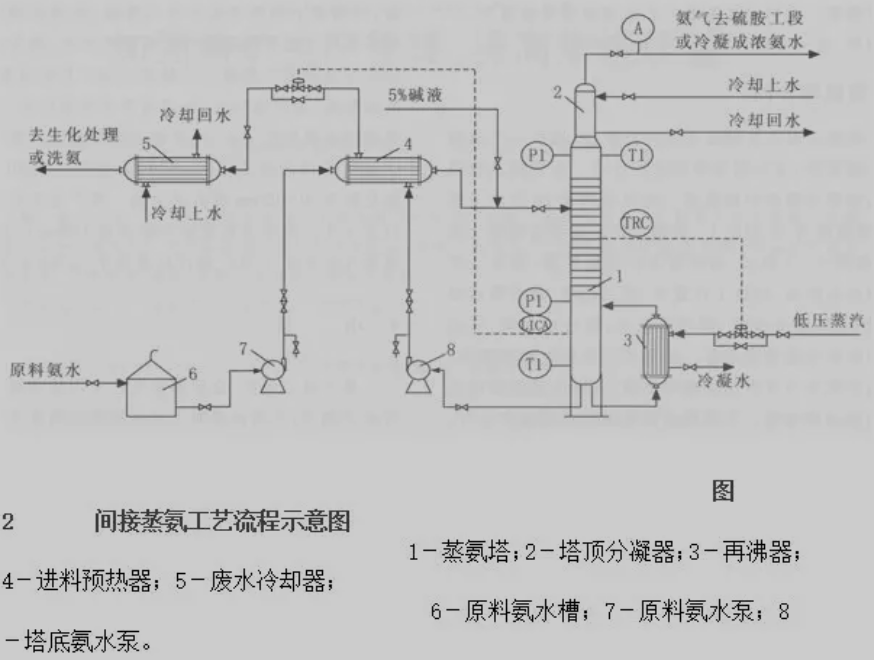 所示,间接蒸氨工艺与直接蒸氨工艺不同之处就是利用再沸器加热蒸氨塔塔底废水,产生的蒸汽作为蒸馏热源,而因加热塔底废水的热源不同又可分为:水蒸汽加热、煤气管式炉加热和导热油加热三种。虽然加热介质不同,但是工作原理是相同的,各厂可以根据自己的具体情况选定。本文仅以水蒸汽加热为例来分析直接蒸氨工艺与间接蒸氨工艺的区别。